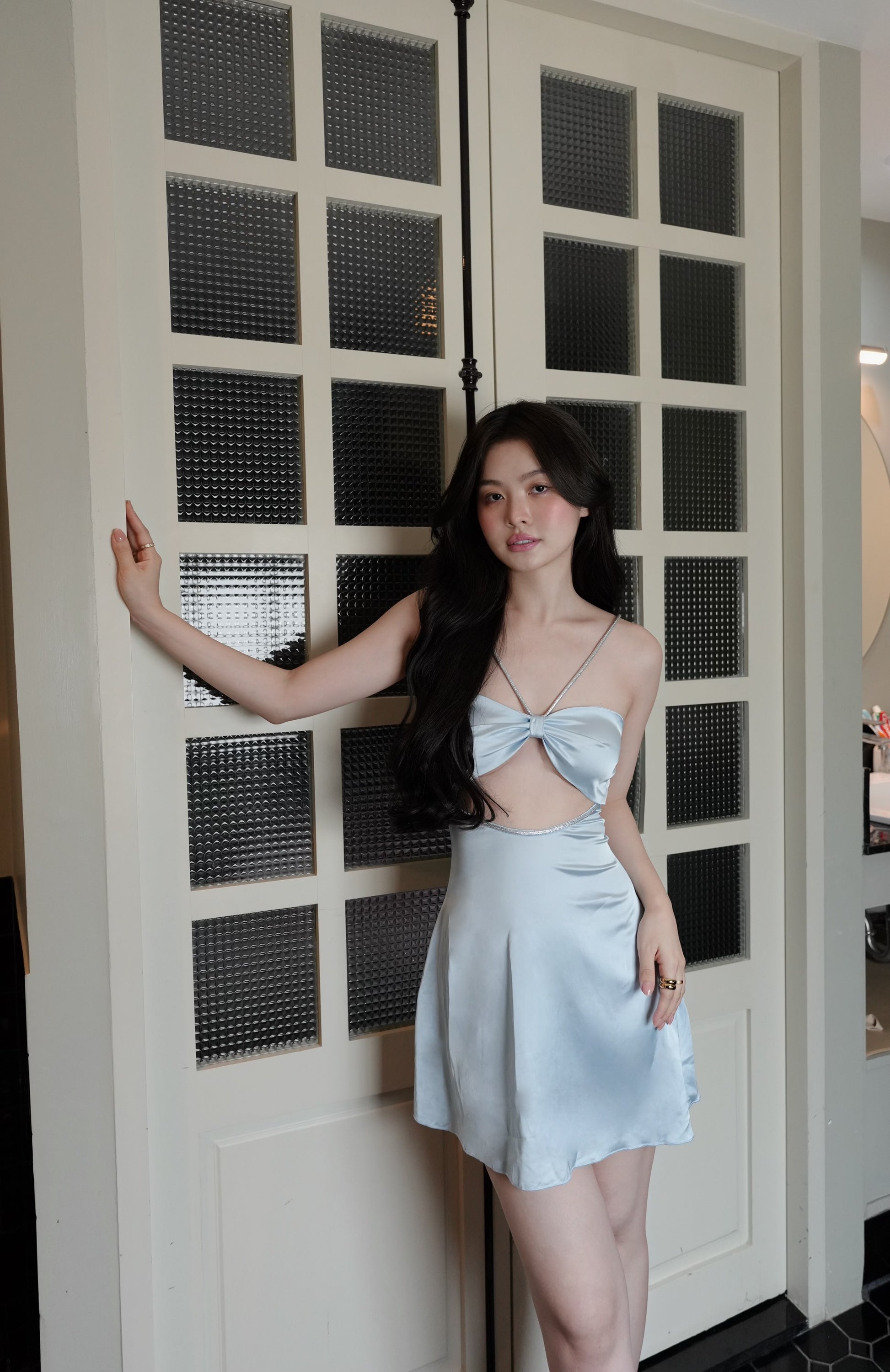 BLUE SATIN CUT-OUT DRESS